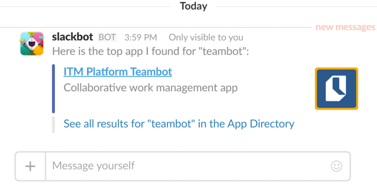 No ITM Platform acabamos de lançar um novo aplicativo para o Slack especialmente concebido para a gestão colaborativa do trabalho. Com o ITM Platform Teambot, os nossos usuários podem utilizar o chat do Slack para: