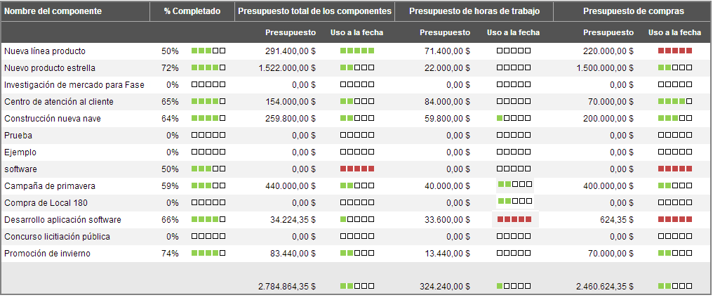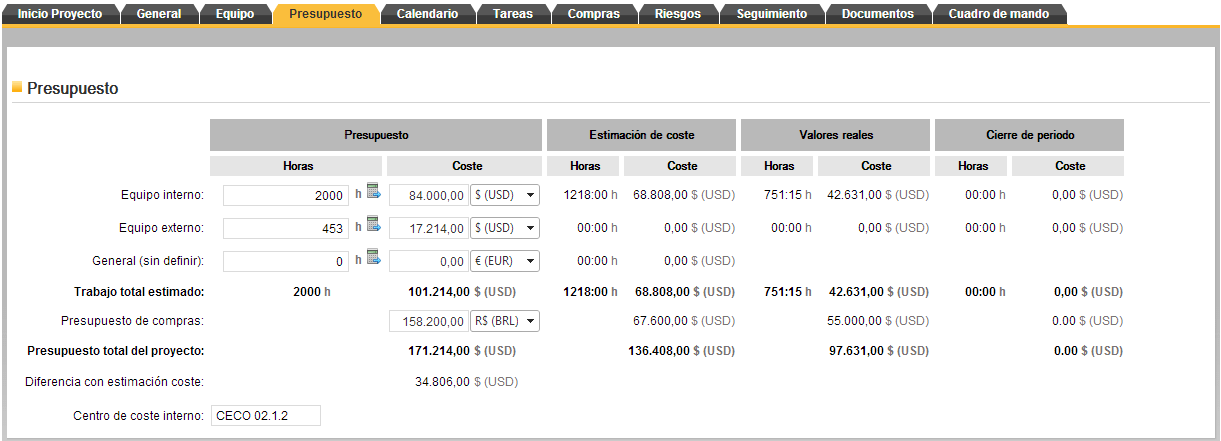 - Custo estimado ou bottom-up: é uma estimação de custos que o sistema realiza baseando-se nas estimações de horas e compras feitas pelo gerente de projetos na etapa de planificação. Por exemplo, dizemos que o projeto consumirá “n1” de horas nesta tarefa e “n2” naquela outra, que usará “z1” materiais para a fabricação e “z2” materiais de marketing para a gestão comercial. A soma de todos eles formará o custo estimado à medida que a planificação e atualização do projeto irá avançando.