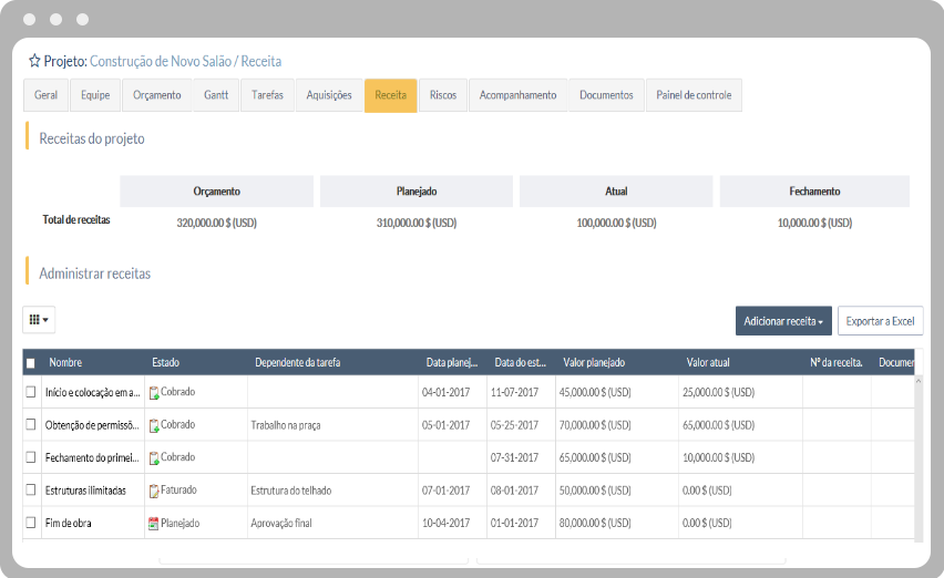 Controle todos os aspectos financeiros de seus projetos: custos, receitas, gerenciamento de fornecedores, orçamentos globais e estimativas de custo.