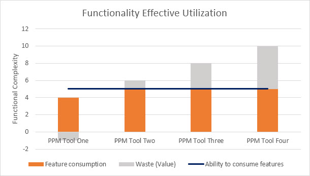 Waste (the gray area) can be economically valued by comparing the cost of the solution that reaches the Ability to Consume Features (the blue line). In our example, PPM Tool Two is the solution that covers all the needs. Therefore, the difference in cost of any other more expensive solution will be the economic value of Waste.
