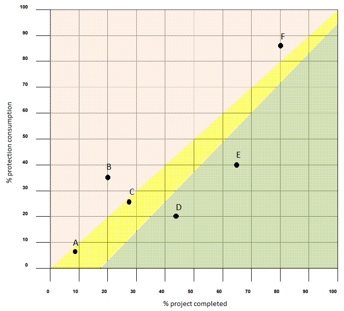 - Pink area. These projects have consumed more protection than estimated for their degree of progress, so they will not meet the schedule if their performance does not improve or countermeasures are implemented. This would be the case for projects B and F.