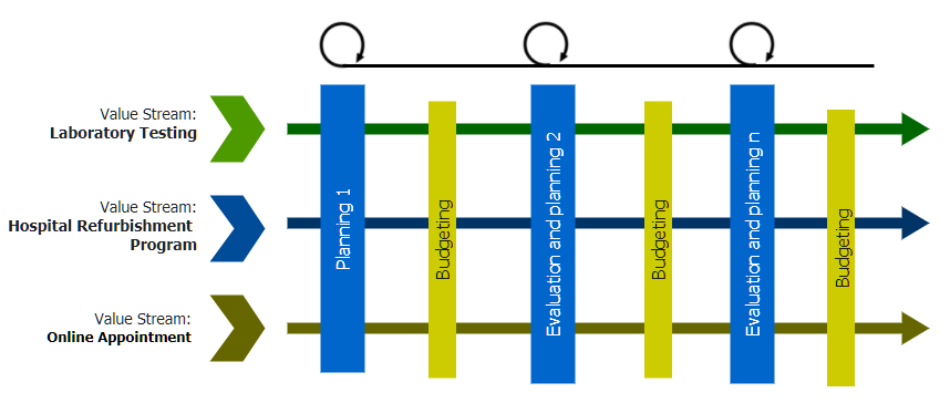 Value streams are budgeted, then projects and activities are funded, allocating the resources and money required to carry out the piece of work that will deliver the highest value.