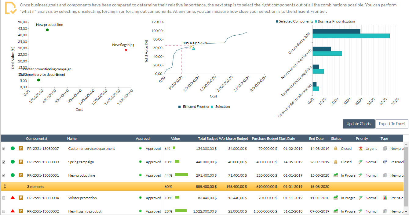 In this article, we will use the available budget as an example of a main constraint because this is the most frequent case. Imagine that we should select a portfolio of projects that does not exceed $900.000. Taking the previous list into account, the “New Star Product” ($ 1.5 M) exceeds that amount and also provides a similar value to other more economical projects.