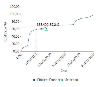 With this selection achieve the given criteria. But note that the efficient central border graph is indicating the selection is not optimal (value/cost) and that there are better combinations: similar value for less money or greater value for the same sum.