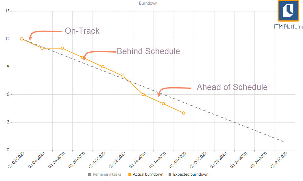 Behind schedule: If the actual progress line is above the expected line, it means that the team is delayed and should have completed more work at this point.