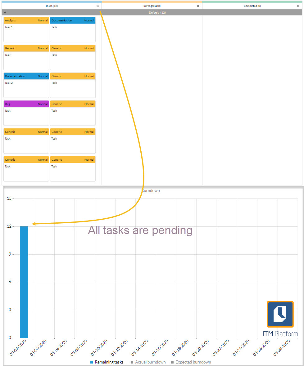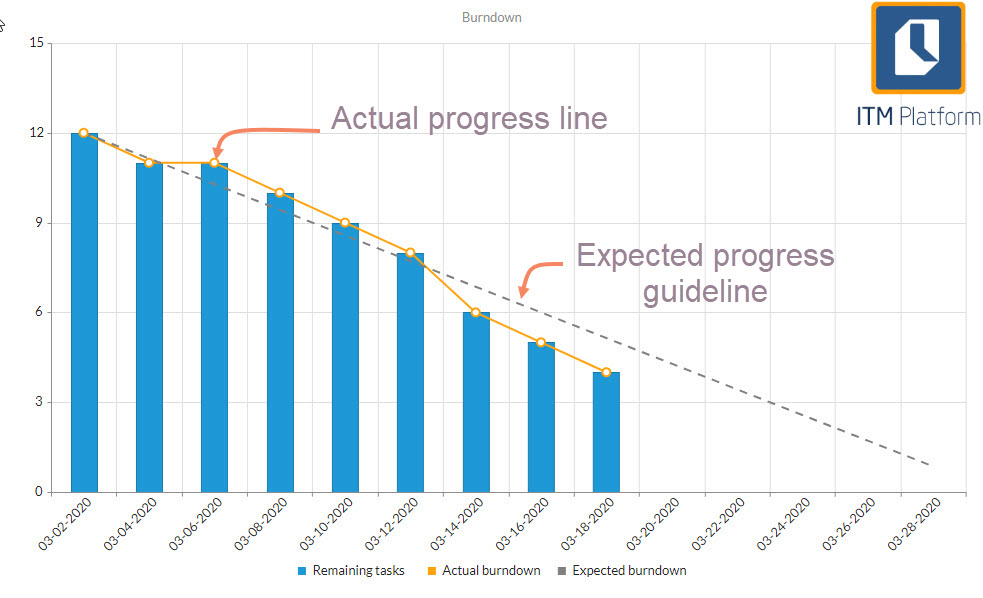 Represents the actual number of tasks pending by intervals. That is, the overall pending tasks at the start minus those completed. We’ve explained this concept before with a bar chart example.