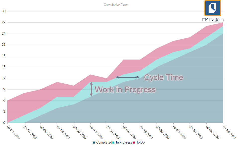 The CFD provides two fundamental pieces of information in agile management: Work in Progress (WIP) and Cycle Time (CT).