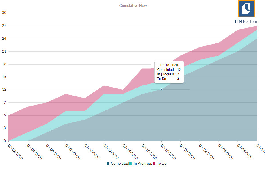 As you go along, the diagram shows the flow of tasks by status. It is called ‘cumulative’ because it does not measure increments between intervals but counts all the tasks for each status, regardless of whether or not that was their status before.