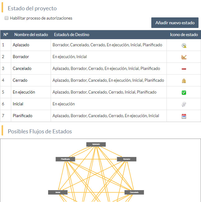- Los estados por los que un proyecto puede pasar. Por ejemplo, podemos definir que los proyectos cuyo estado es “en borrador” sólo puedan cambiar a los estados “iniciado” o “descartado”.