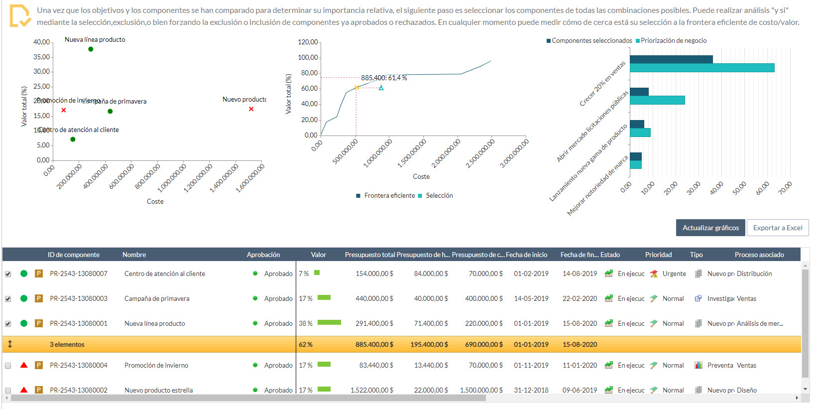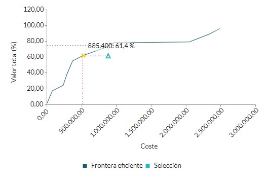 Con esta selección cumpliríamos con los criterios. Pero observe que el gráfico central de frontera eficiente está indicando que la selección no es óptima (valor/coste) y que existen combinaciones mejor que esa: similar valor por menos dinero o mayor valor a la misma suma.