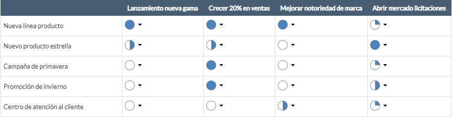 Ignorando por ahora la relevancia de cada objetivo sobre el plan estratégico, este paso asignará un peso a la aportación de cada iniciativa a cada objetivo. Este peso se traducirá a un número en base 100, pero si utiliza ITM Platform podrá también usar la comparación por pares anteriormente utilizada o bien utilizar una metodología cualitativa a base de ideogramas como la de la imagen (Harvey balls), que ofrece un apoyo visual al conjunto.