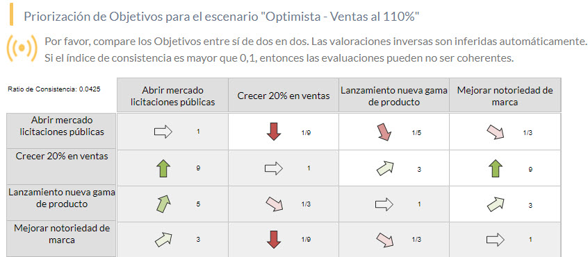 Esta sencilla tabla generará una lista ordenada y cuantificada de objetivos. Como complemento de apoyo, ITM Platform calcula un “ratio de consistencia” que indica cómo de lógica y objetiva está siendo la priorización. En este artículo (enlace externo en inglés) encontrará una explicación de cómo se calcula este índice Es posible realizar diferentes conjuntos de comparativas entre los mismos objetivos a través de escenarios, e incluso usar diferentes objetivos para distintos programas. La realidad es compleja y no siempre hay una única combinación o escenario.