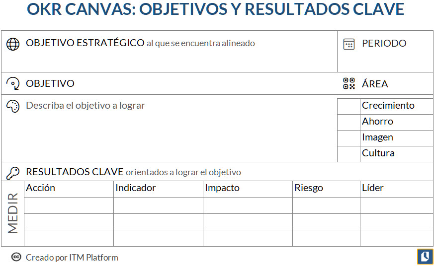 Algunas organizaciones, especialmente aquellas acostumbradas a modelos de gestión tradicionales, pueden encontrar útil utilizar un Canvas para llegar a la definición de sus OKR.